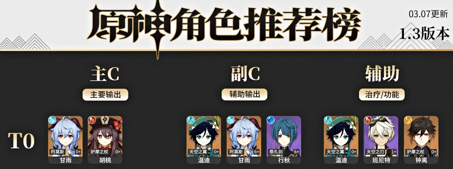 가장 먼저 0티어에 대해 알아보겠습니다. 왼쪽부터 딜러, 보조 딜러, 서포터 순서입니다. 3월에 신규 캐릭터 호두가 추가되면서 원신 등급표에 변동이 생겼습니다. 이후 추가 캐릭터나 밸런스 패치가 없는 이상 해당 등급표는 지속되리라 보입니다.