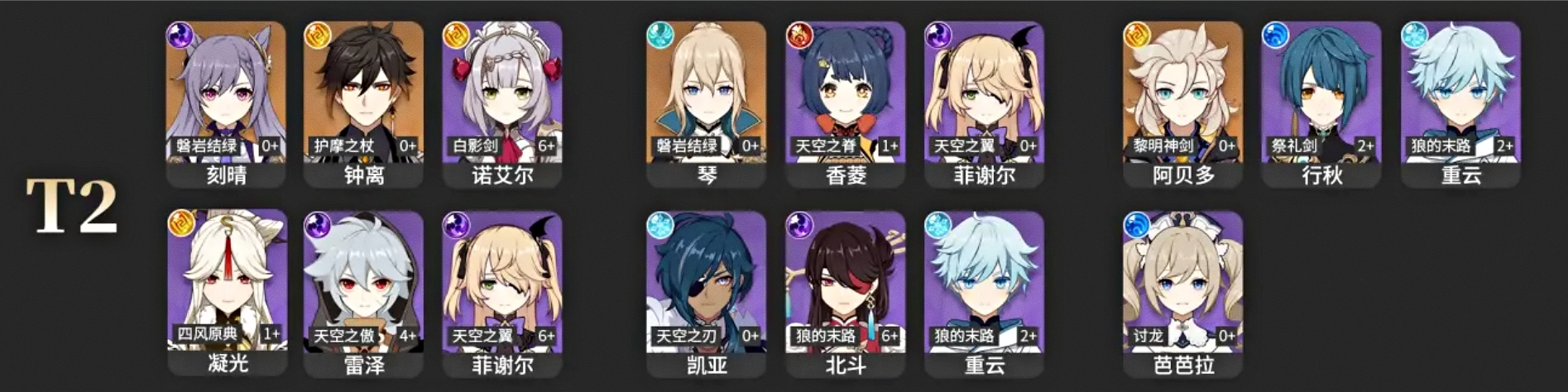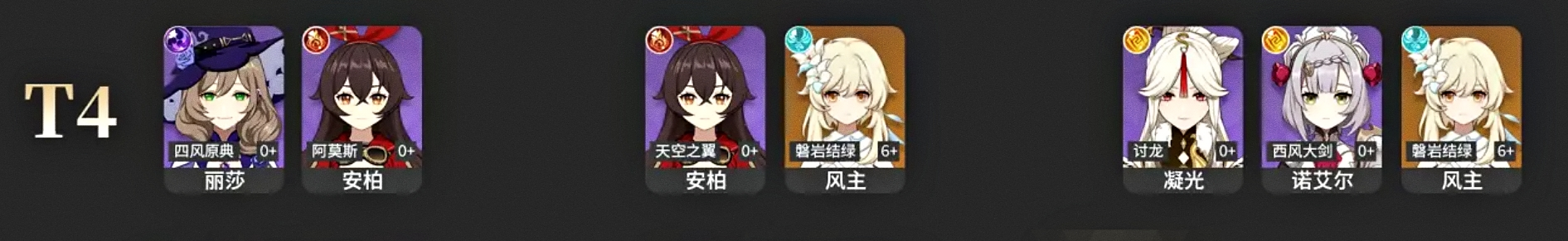 3티어와 4티어에 자리 잡고 있는 캐릭터들은 대부분 게임 플레이 시 기본적으로 제공되는 캐릭터들입니다. 자연스럽게 얻을 수 있는 캐릭터들이다 보니 편하게 파티 구성하여 원신 즐기시다가 높은 티어 캐릭터를 얻게 되면 교체하시면 되겠습니다.